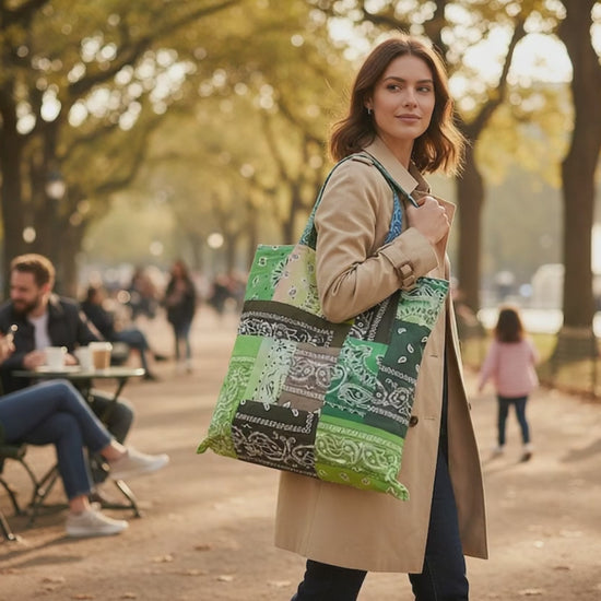 The Arizona Love Handmade Bandana Patch Bag is a unique and stylish square-shaped tote bag made from 100% cotton.