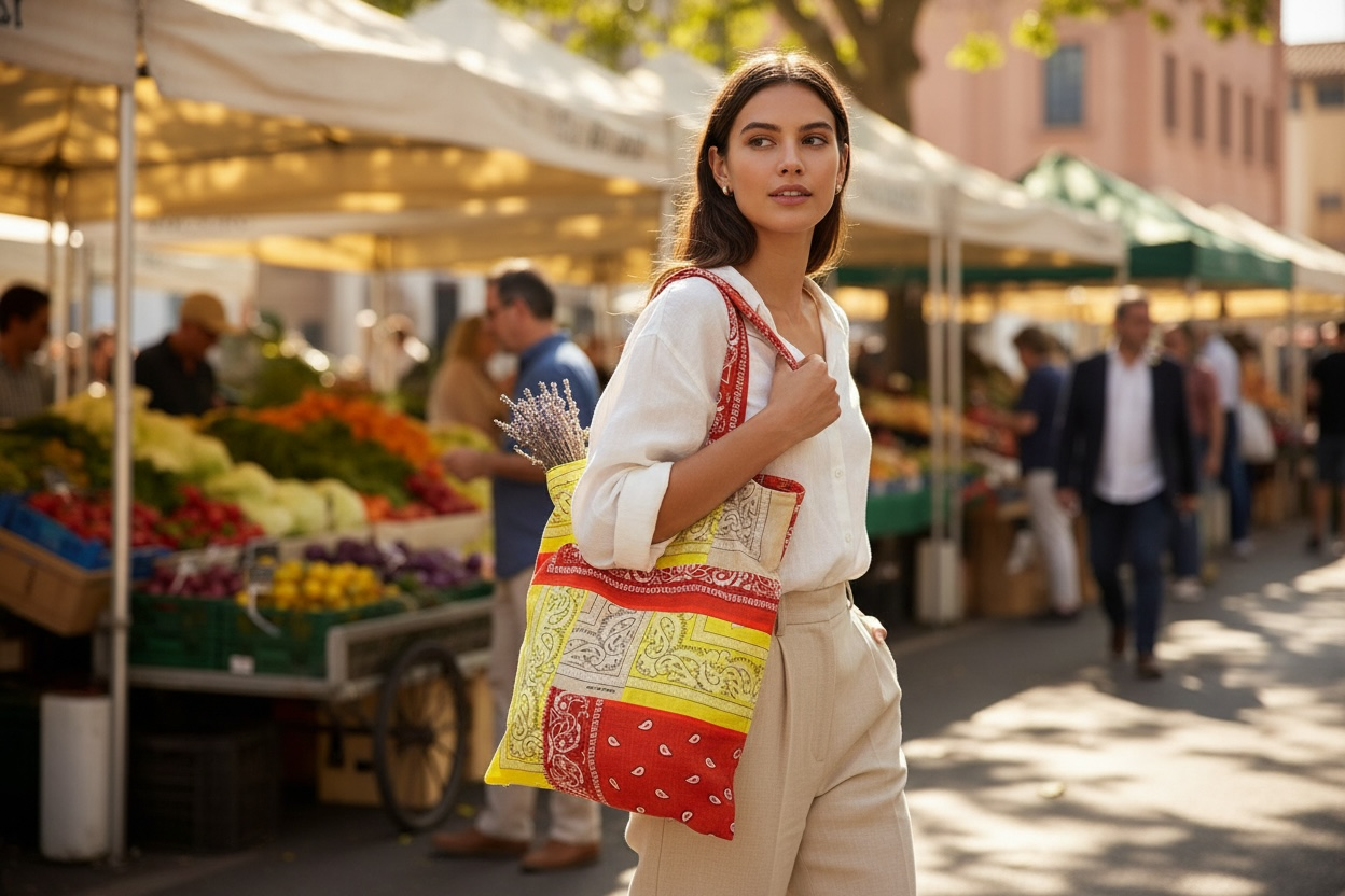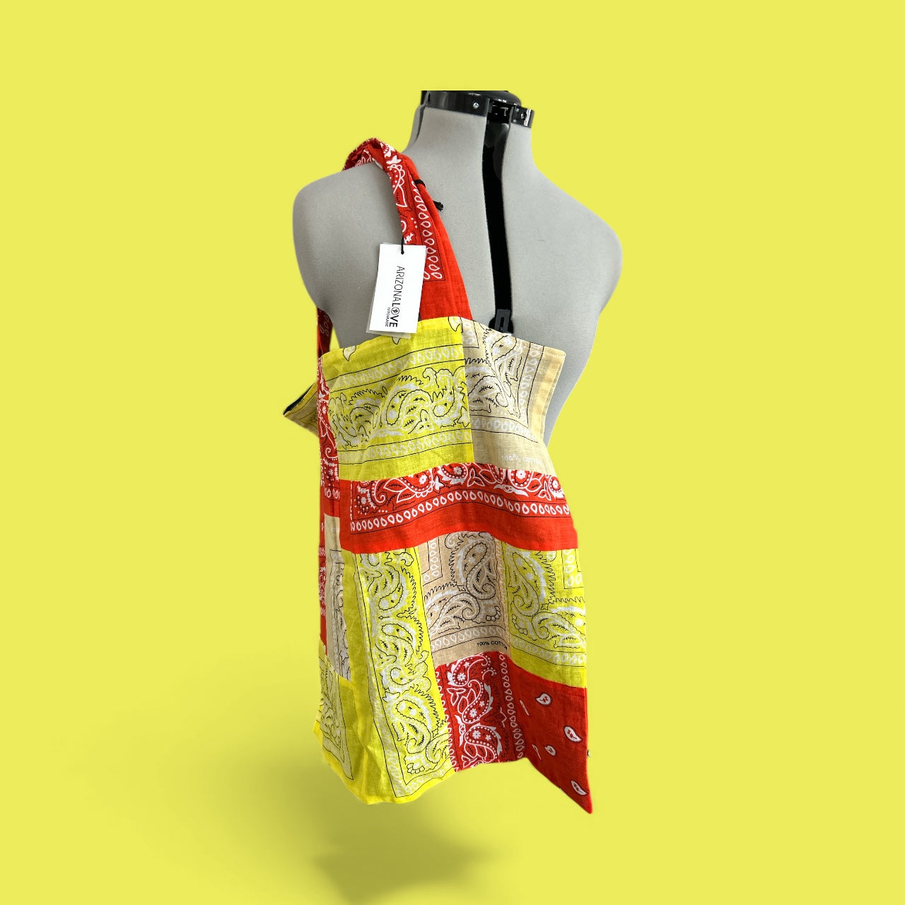 The Arizona Love Handmade Bandana Patch Bag is a unique and stylish square-shaped tote bag made from 100% cotton.