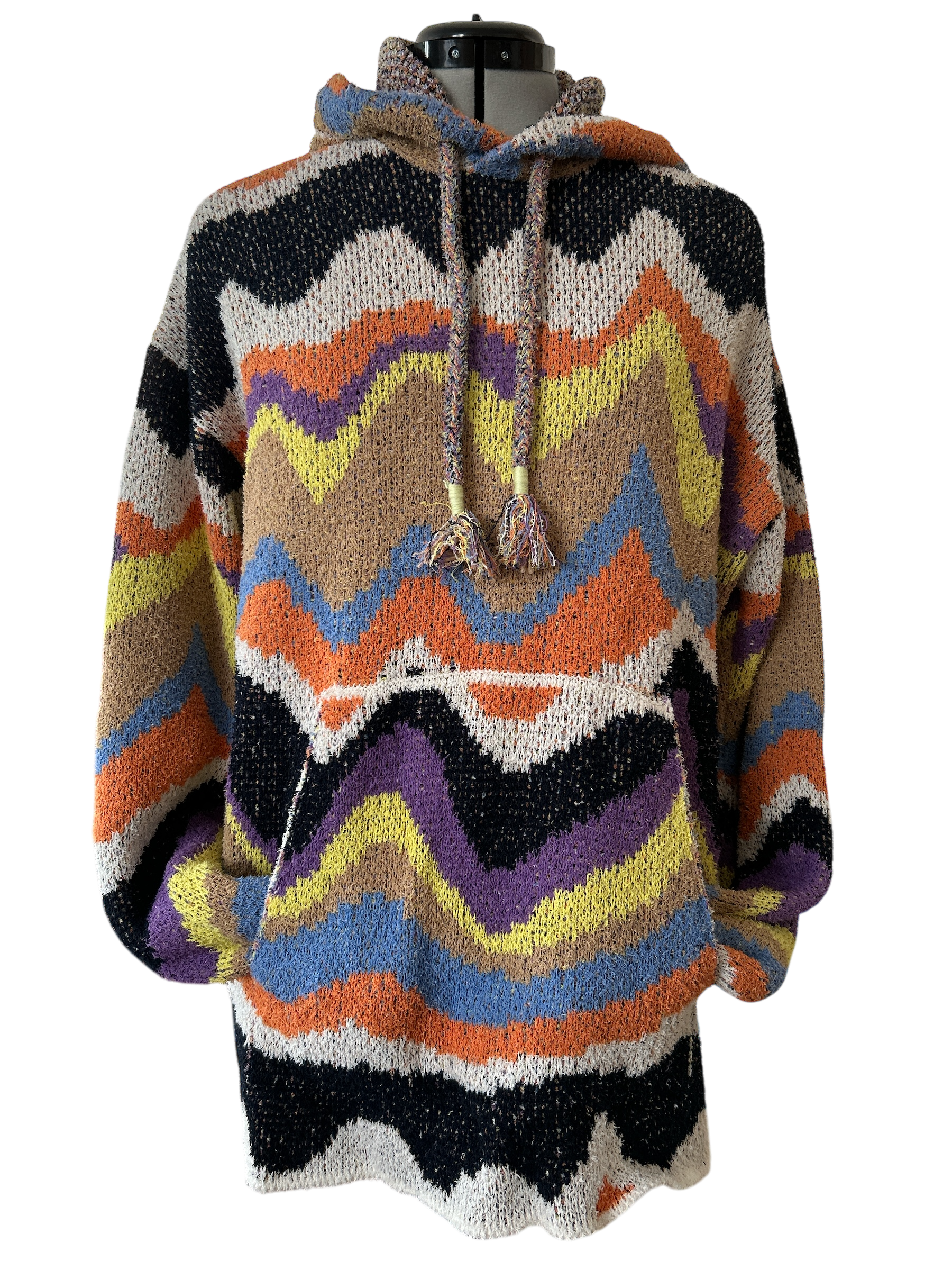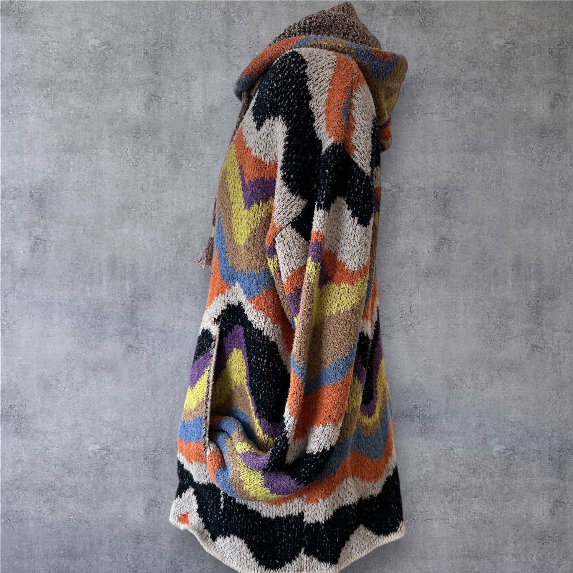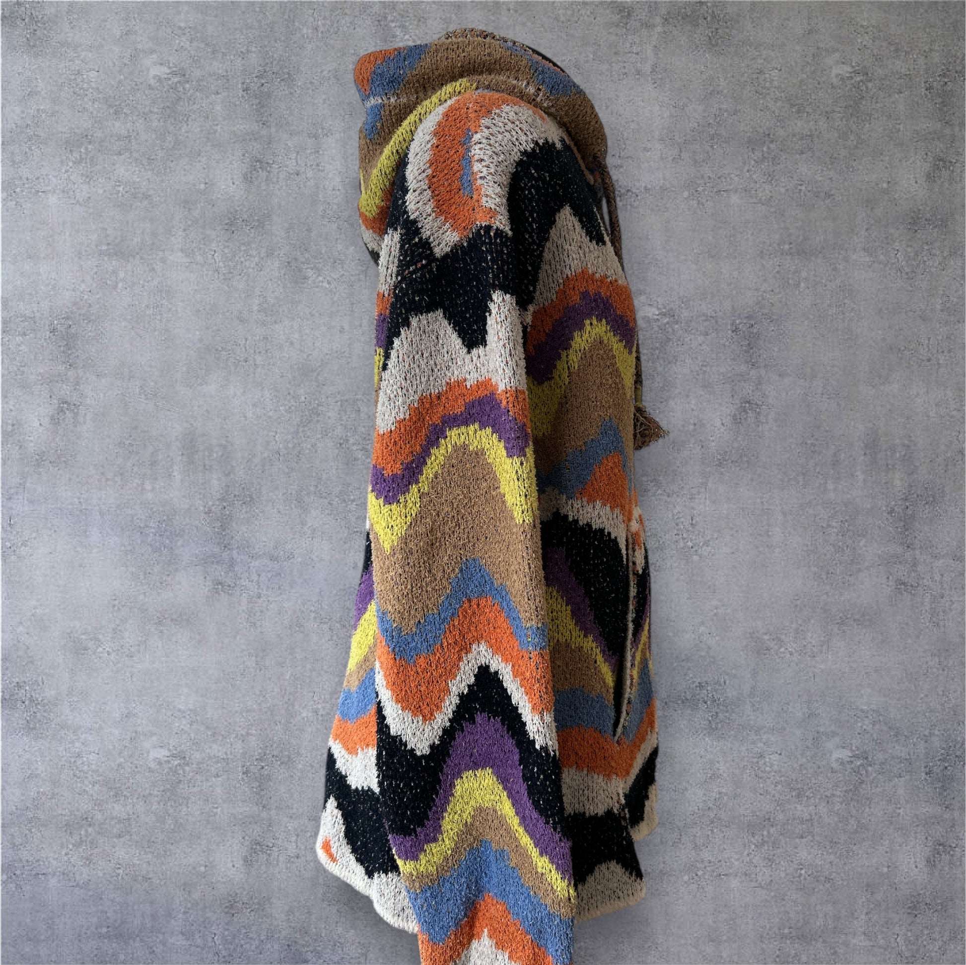 This unisex piece, boasting a vibrant multi-coloured chevron pattern, is a testament to designer appeal with its hand-knitted accents and relaxed fit silhouette.