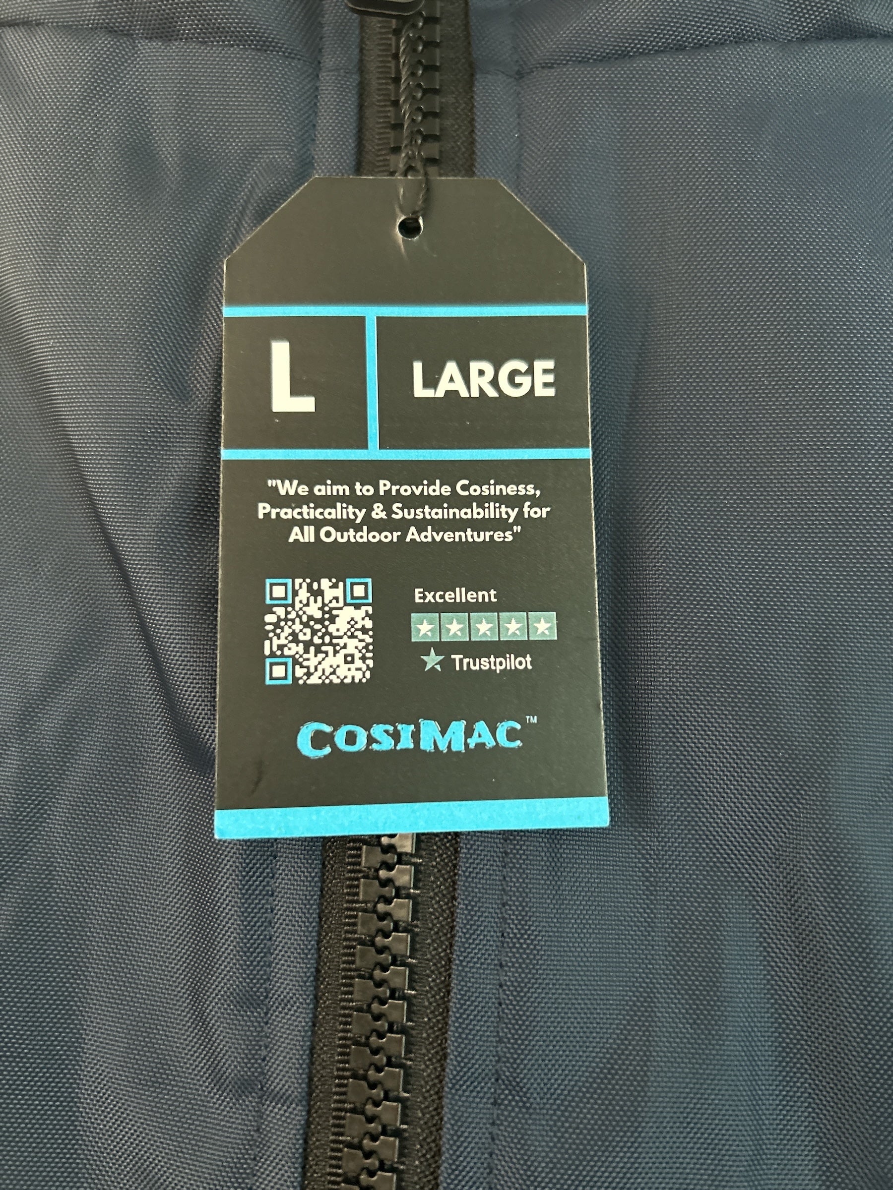 NEW WITH TAGS, COSIROBE FLEX WATERPROOF DRY CHANGING ROBE MIDNIGHT NAVY. SIZE LARGE. HOODED.