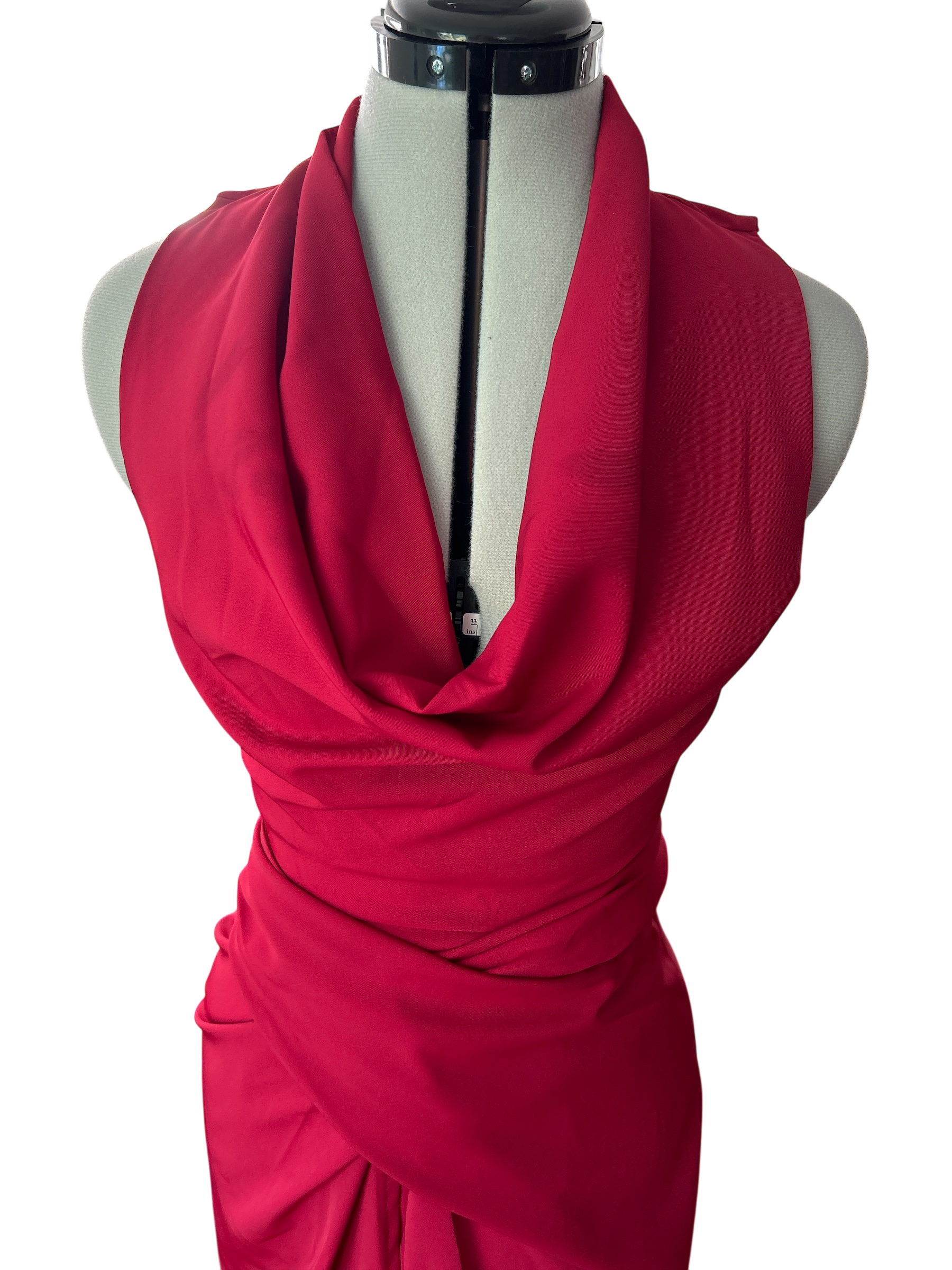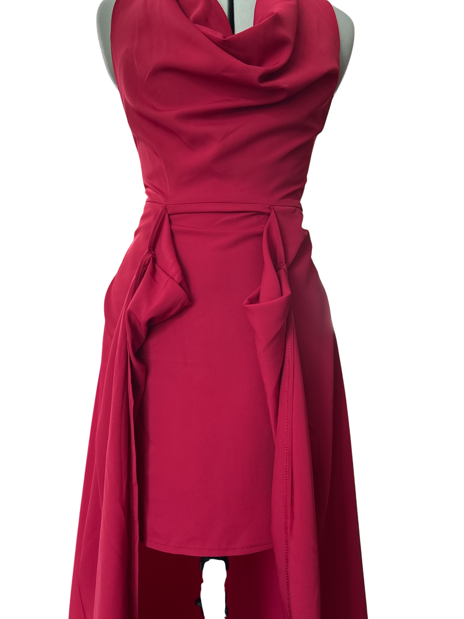 RED SPANISH DESIGN DRESS BY CAYRO, UK SIZE SMALL. UK 6 - 10. MULTI-WAY ATTACHED MINI-UNDERSKIRT. COWL NECKLINE.New without Tags.
