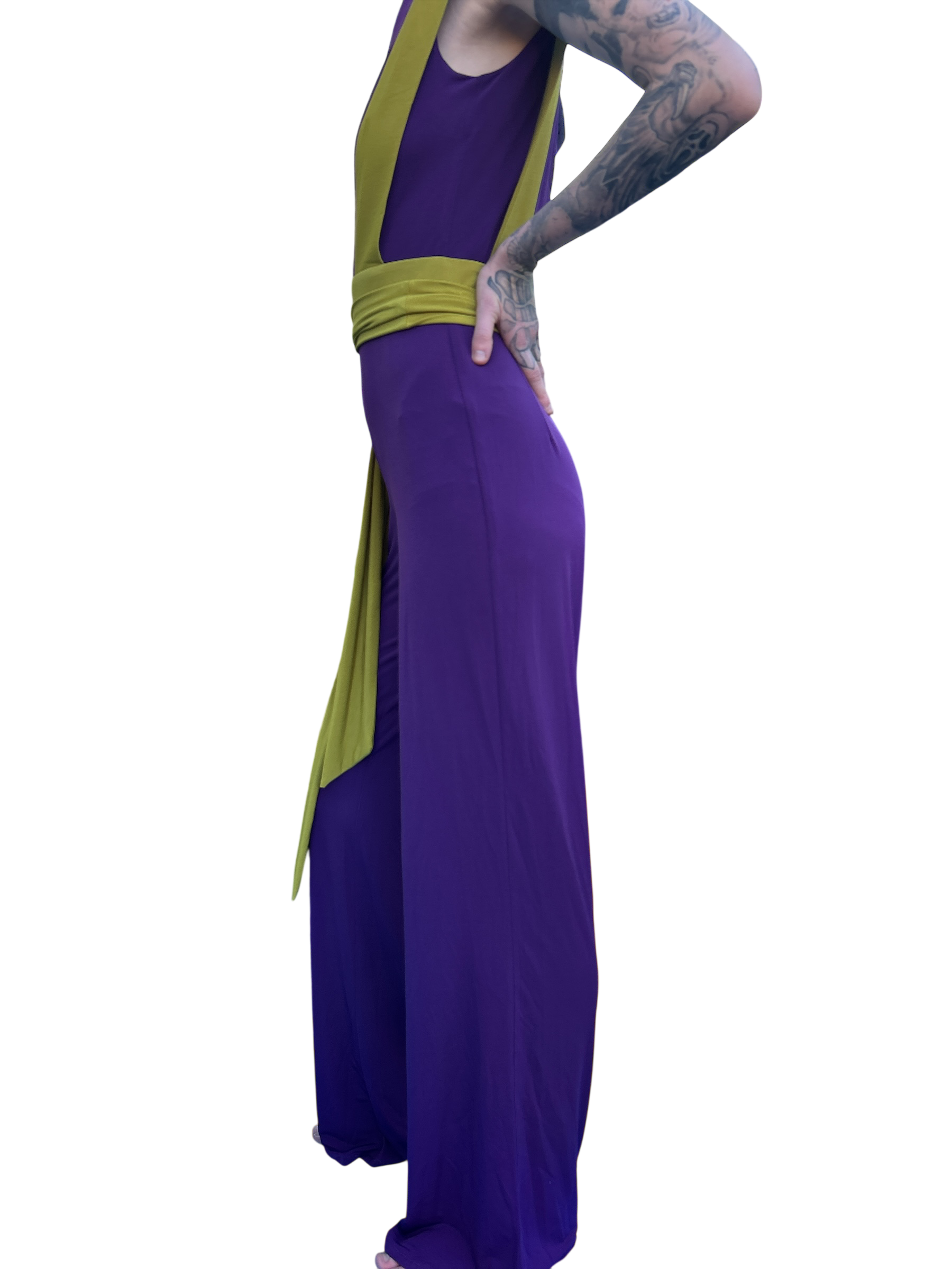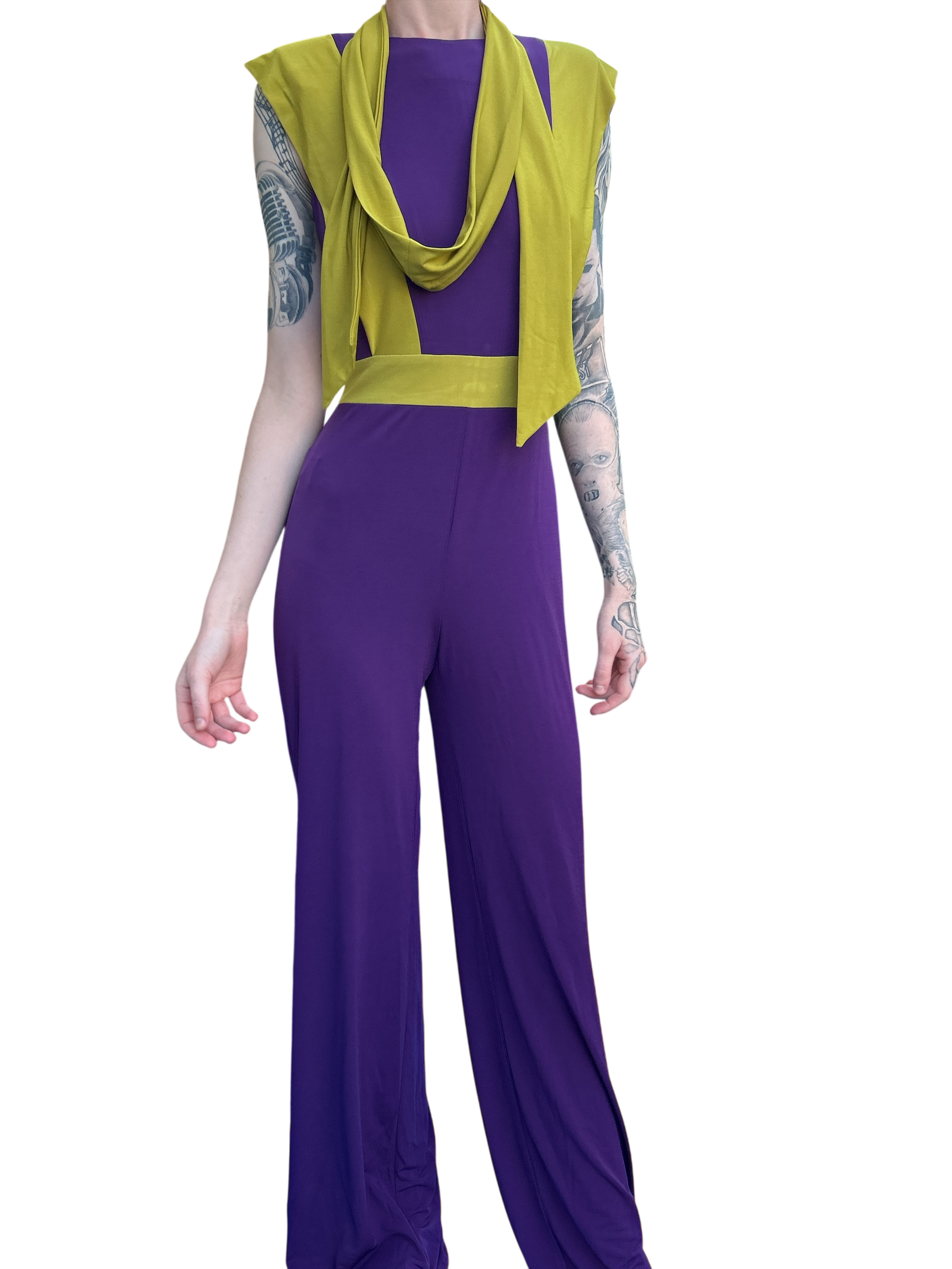 SPANISH DESIGNER CAYRO NEW AND TAGGED PANTSUIT IN VOILET WITH LIME INTERCHANGEABLE COLOURED SCARF. UK SIZE EXTRA SMALL.